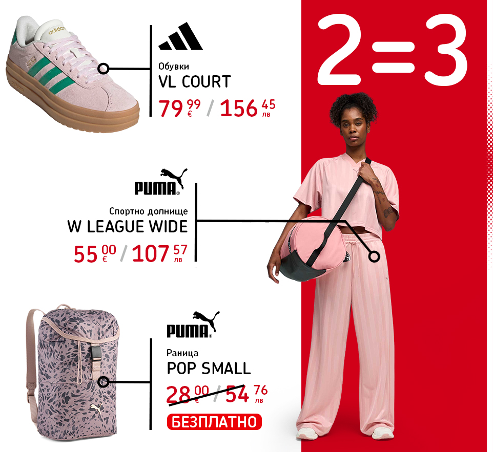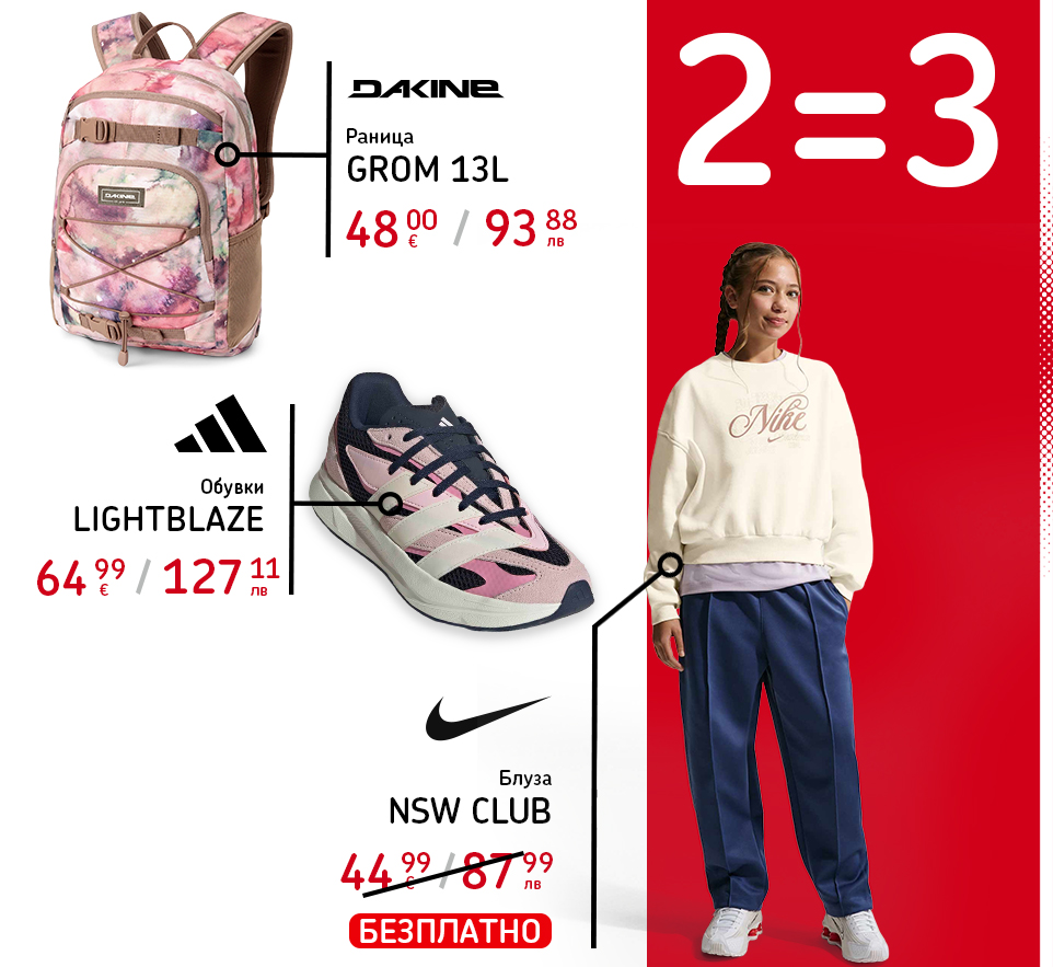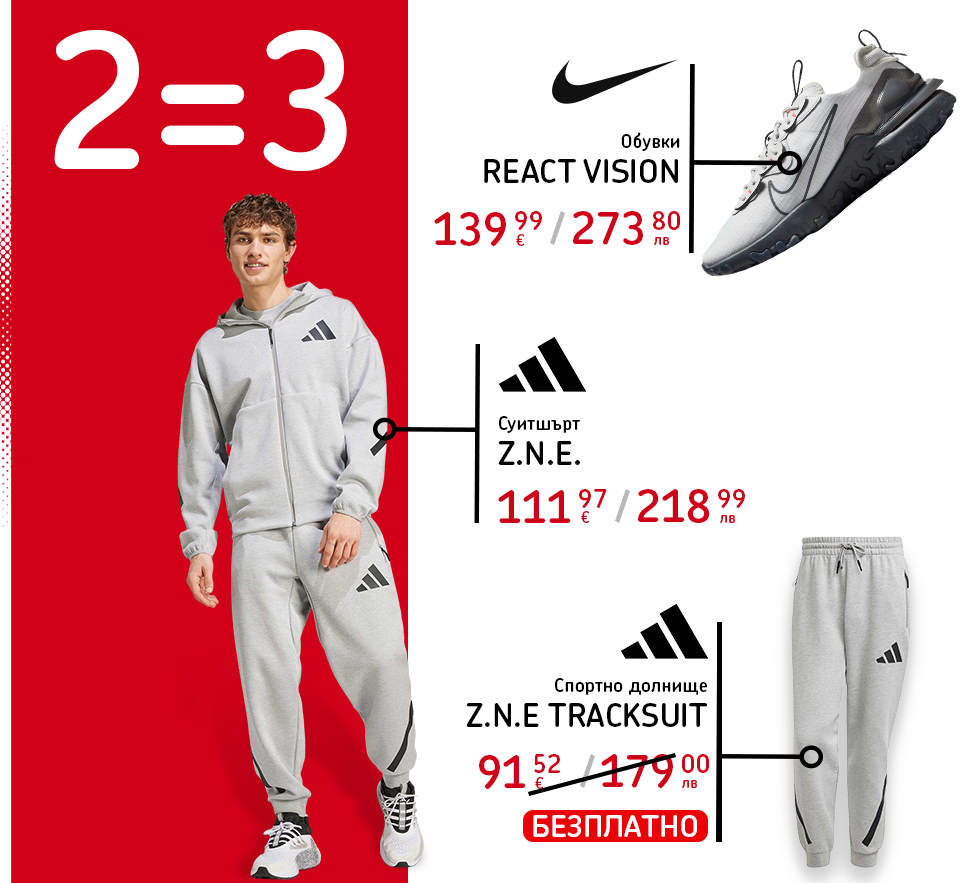 * Клубната екипировка на ПФК Левски не участва в акцията. - При покупка на 2 артикула, получаваш 3-ти безплатно. Безплатен е артикулът с най-ниска стойност. Крайната отстъпка се начислява пропорционално на трите артикула.