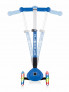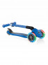 Сгъваема тротинетка за деца на 2 години – тротинетката на Globber, създадена да “расте” с вашето дете! Благодарение на телескопичното си кормило тя се регулира на височина спрямо ръста на детето в 3 позиции (54 см, 61 см, 68 см от земята) и по този начин се използва по-дълго във времето. Подходяща е за деца до 6-годишна възраст. Тази тротинетка за деца на 2 години е сгъваема, а предните ѝ колела светят едновременно в три светлини – синя, зелена и червена. Колелата са направени от прозрачен, висококачествен и високоустойчив полиуретан и са монтирани на висококачествени лагери ABEC 5. Движението с тях е напълно безшумно и плавно. Дръжките на Т-образното кормило са от устойчив цветен материал, който не позволява хлъзгане на ръцете. В предната си част детската тротинетка има бутон, чрез който се заключва, за да може да се движи само в права посока. По този начин се улеснява обучението на всяко дете, което прави първите си опити за управление на подобно средство. Завиването с тази тротинетка за деца се осъществява чрез накланяне на кормилото наляво или надясно. Платформата е ниска – за повече стабилност при управлението на превозното средство. Има специално релефено покритие, което не позволява подхлъзване. Спирачката е дълга и обхваща цялото задно колело, което спомага за по-доброто спиране и в същото време предпазва самото колело. Играе ролята и на калник.